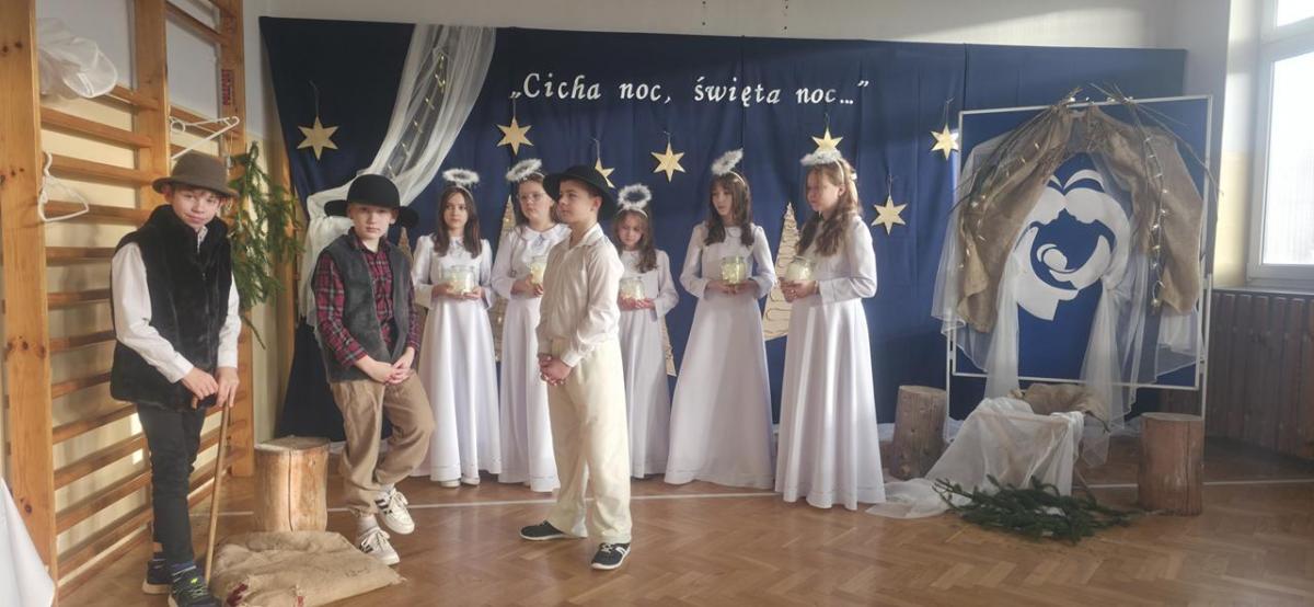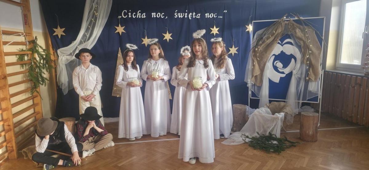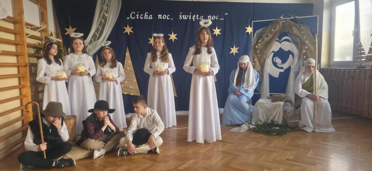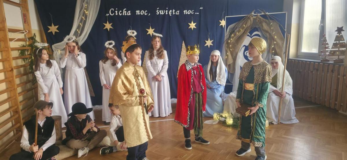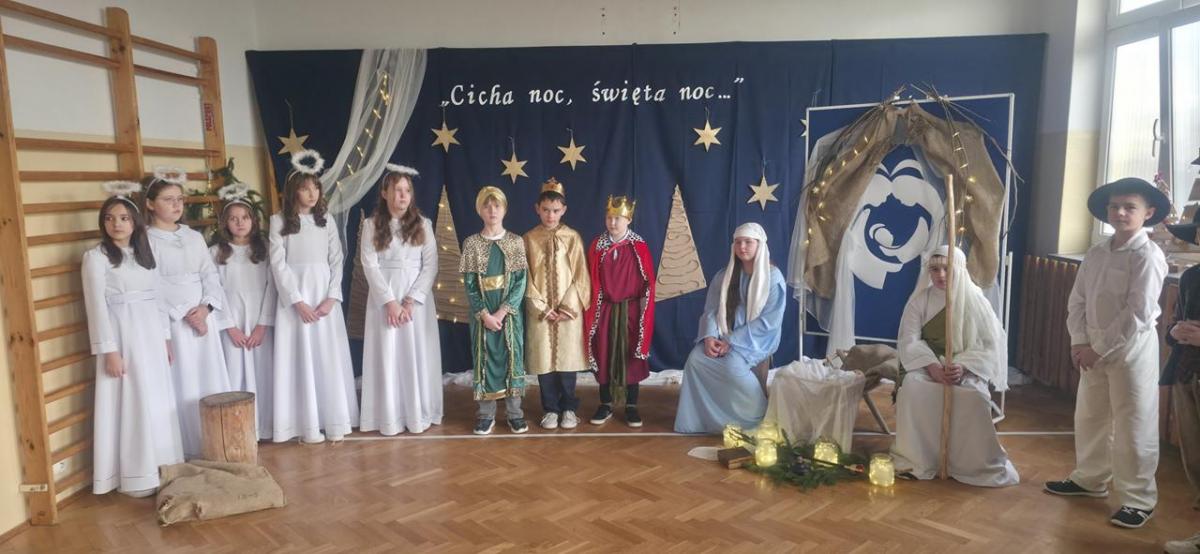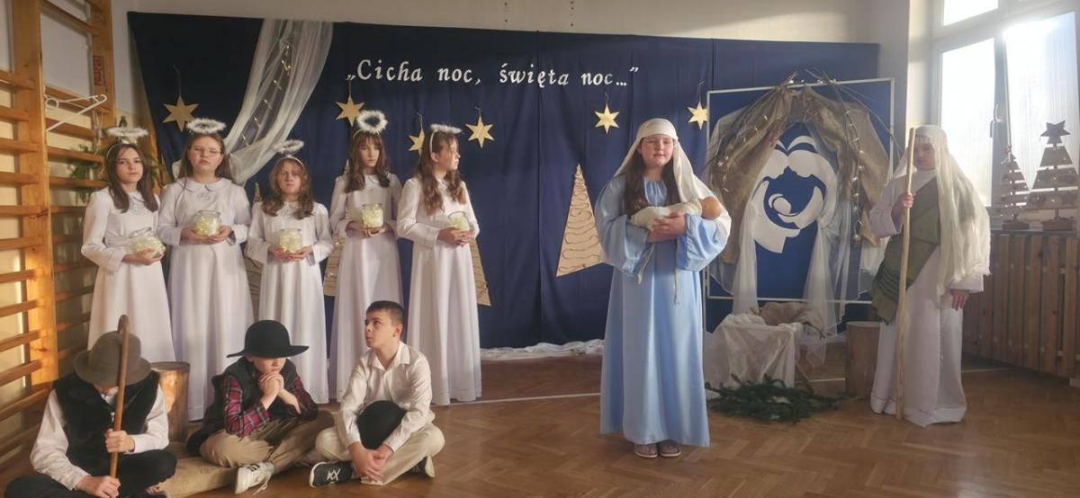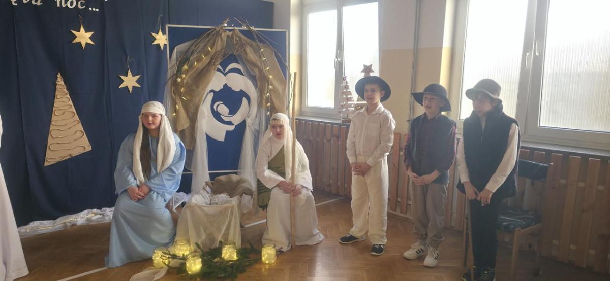 19 grudnia 2025 r. w naszej szkole odbyły się tradycyjne jasełka, w których zachwycili uczniowie klasy 4a. Ich przepiękny montaż słowno-muzyczny, pełen ciepła i świątecznego uroku, magicznie przeniósł wszystkich w betlejemską noc narodzin Jezusa – z aniołami śpiewającymi kolędy, pasterzami i Trzema Królami klęczącymi u żłóbka. Występ klasy 4a udowodnił, jak wielki potencjał drzemie w naszych uczniach, gdy połączą wysiłek z pasją.